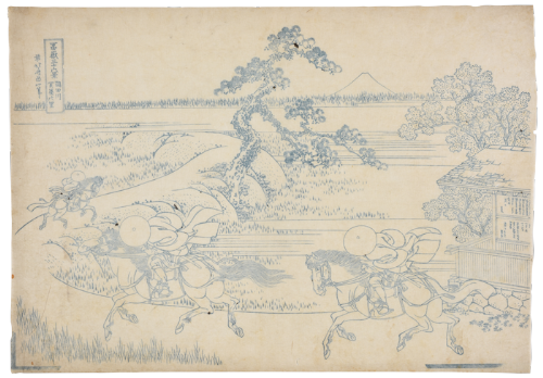 当館は《冨嶽三十六景》全46図の内43図、同じ図で複数点あるものがあり、合計62点を所蔵しています(2022年1月現在)。その内訳は、新庄コレクション(1983年度収蔵)・21点、永田コレクション(2017年度収蔵)・21点、そして島根県が独自に購入した20点です。この62点の中には、シリーズ中で“三役”とよばれる人気作「凱風快晴」(赤富士)・「山下白雨」・「神奈川沖浪裏」が各2点ずつ、2セットあり、中でも新庄コレクションの赤富士は、1970年の「万国博美術展」で世界の名画と共に展示された逸品です。他にも摺りや保存状態が良好な作品があり、例えば、新庄コレクションの「深川万年橋下」、永田コレクションの「江都駿河町三井見世略図」・「諸人登山」、島根県購入の「常州牛堀」・「本所立川」・「東海道程ヶ谷」などはいずれも優品といえるものです。また資料的価値が高い、校合摺(色指定のために最初に摺られる輪郭線だけの摺)が3点含まれています。