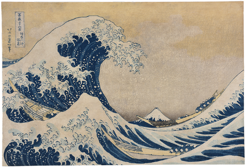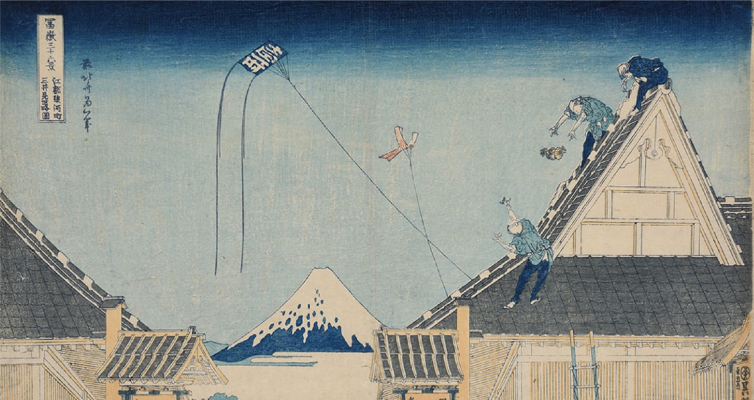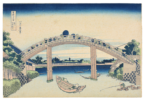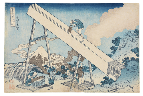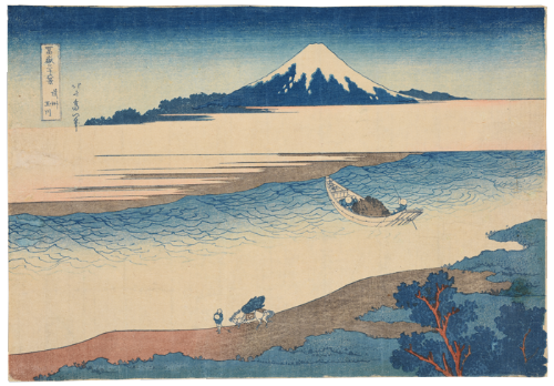 《冨嶽三十六景》は江戸時代を代表する浮世絵師、葛飾北斎(1760-1849)が描いた錦絵(一般向けに販売された多色摺りの浮世絵版画)の揃物(シリーズ)です。出版されたのは天保初期頃(1830〜34)、北斎の70歳代前半期に当たります。全46図から成り、江戸の各所を中心に、東海道沿いや富士山周辺など、東は常陸国(現在の茨城県)から西は尾張国(現在の愛知県)まで、様々な土地からの富士の姿を捉えています。山の稜線や山肌の色合いなど富士自体の造形上の変化はもちろん、構図上の工夫、異なる時刻や季節の設定、様々な人々の営みと組み合わせて、数々の魅力的な富士図を生み出しました。この揃物は庶民の間で高揚していた霊峰富士への信仰も相まって人気を博し、風景画が一躍浮世絵の主要ジャンルとして定着する契機となった記念碑的作品といえます。またその斬新な造形表現は西欧の芸術家たちにも清新な刺激を与え、北斎のみならず日本美術を代表する作品として、国際的にも広く知られています。