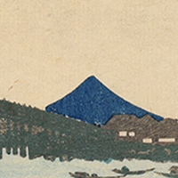 御厩河岸は隅田川の渡し場の一つです。渡し舟には、物売や鳥刺など様々な職種の人々が乗り合い、各々、一日の終わりの心地よい疲れに浸っているようです。近景を輪郭線ではっきりと描く一方、背景の両国橋や対岸、遠い富士を色の面だけで表しています(関連画像)。空気遠近法とよばれる遠近表現であり、同時に夕暮れに沈みゆく町並の雰囲気を巧みに捉えています。