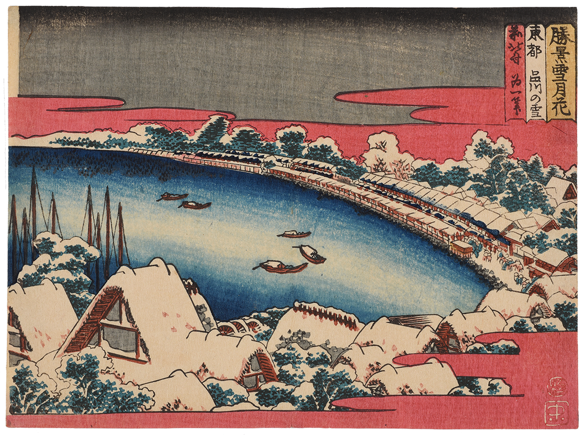 The series Snow, moon, and flowers at famous scenic spots (Shōkei setsugetsuka):Snow at Shinagawa in Edo